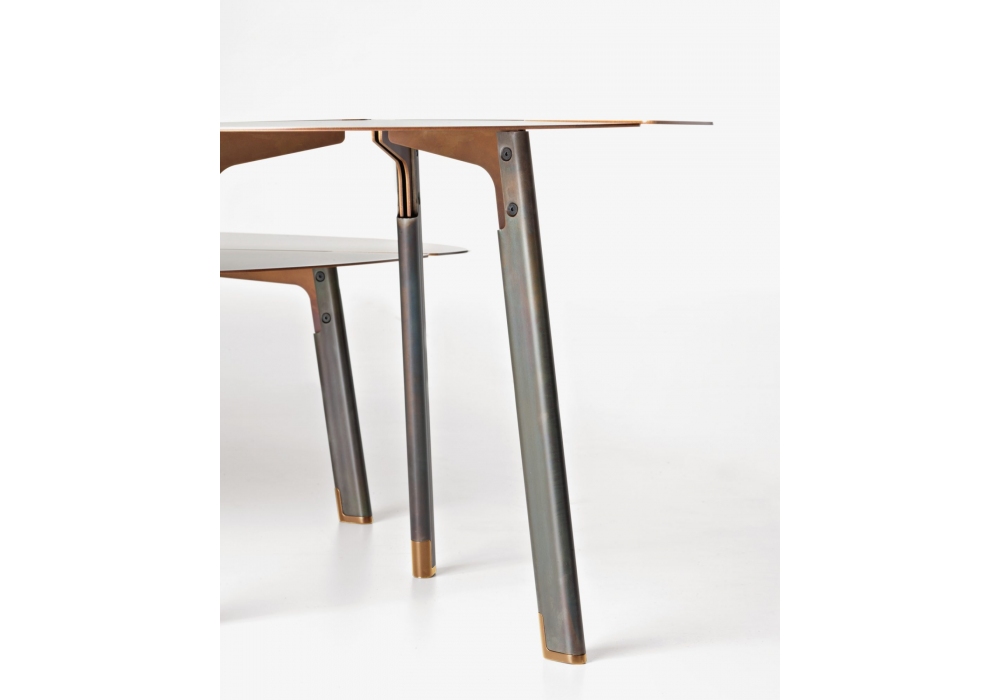 Placas von Lucidi Pevere für DeCastelli entworfen, ist ein Couchtisch aus Metall mit Blütenblattplatte und eisernen Beinen mit Messingspitzen. Verfügbar in mehreren Ausführungen und Abmessungen.