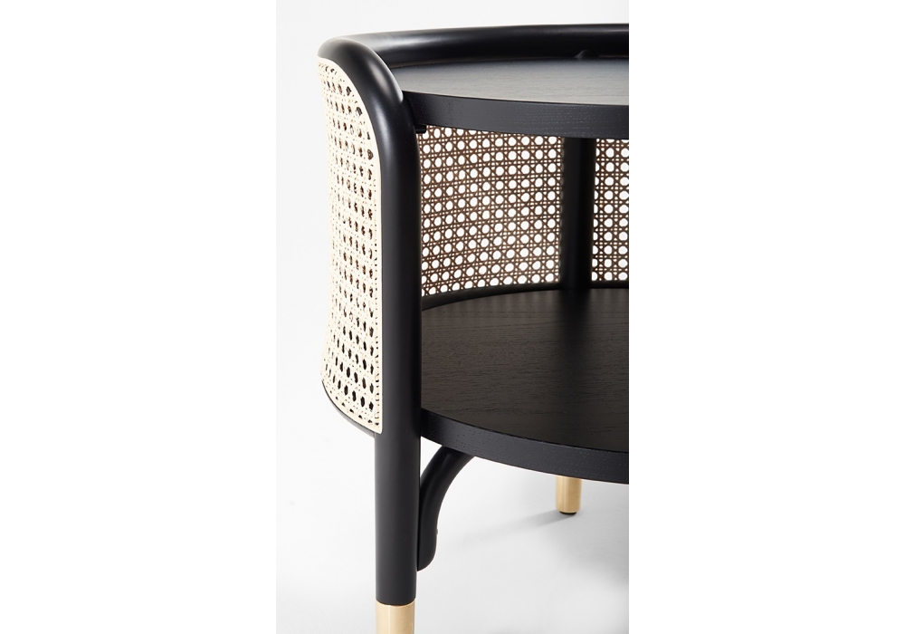Mos von GamFratesi für Gebrüder Thonet Vienna entworfen, ist ein Beistelltisch mit Buchenbugholzgestell und eingesetztem Wiener Geflecht. Regale aus offenporigem, lackiertem Eschefurnier. Messing-Füßen.