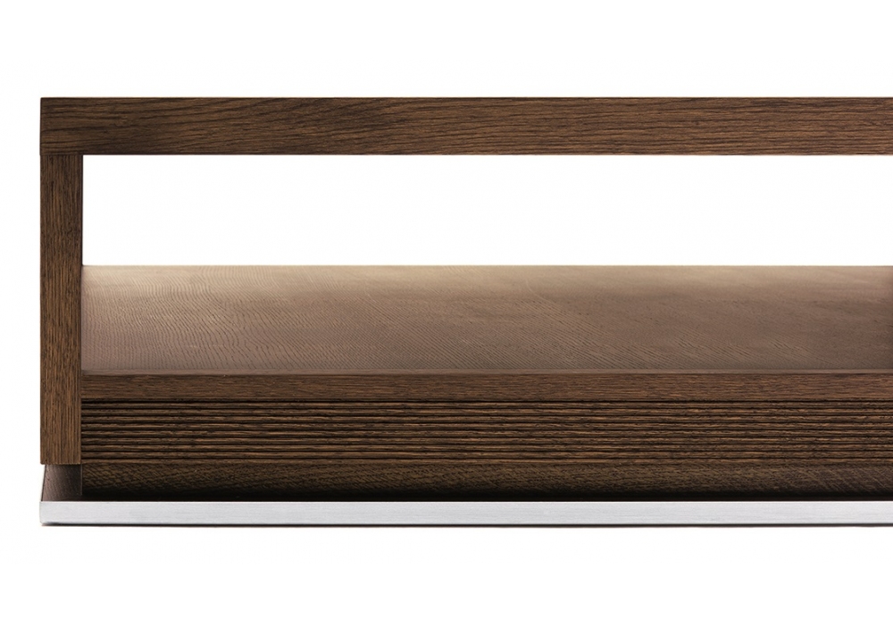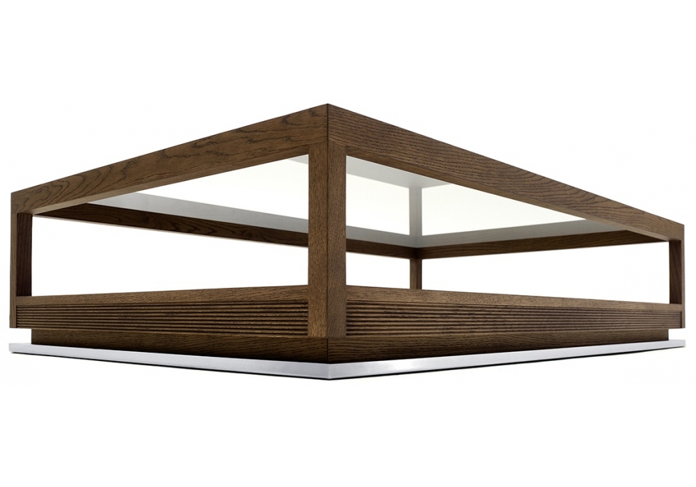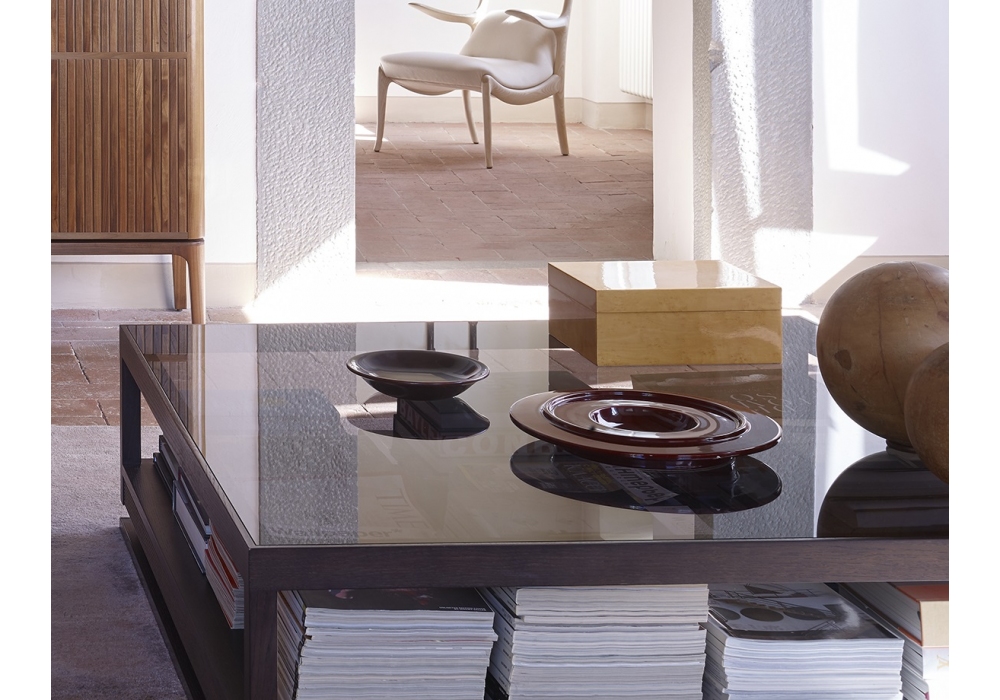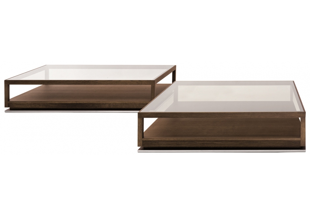 I.C.S. von Roberto Lazzeroni für Ceccotti Collezioni entworfen, ist ein Couchtisch aus massiver Eiche und furniertem Sperrholz. 6 mm Glasplatte. Untergestell aus satiniertem Edelstahl oder brüniertem Messing. Verfügbar in 3 Abmessungen.
