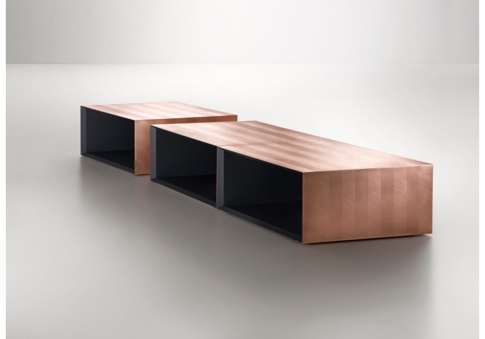 Alpha von Martinelli Venezia für DeCastelli entworfen, ist ein Couchtisch auf Rhomboidbasis. Die einfache Form macht es modular: Kombinieren Sie es mit anderen identischen Elementen, übersetzt oder gedreht. Das mit der DeErosion-Technik bearbeitete natürliche Kupferleder erzeugt ein diagonal gestreiftes Muster, das die Geometrien verbessert und den grafischen Effekt betont. Innenstruktur aus lackiertem Holz.