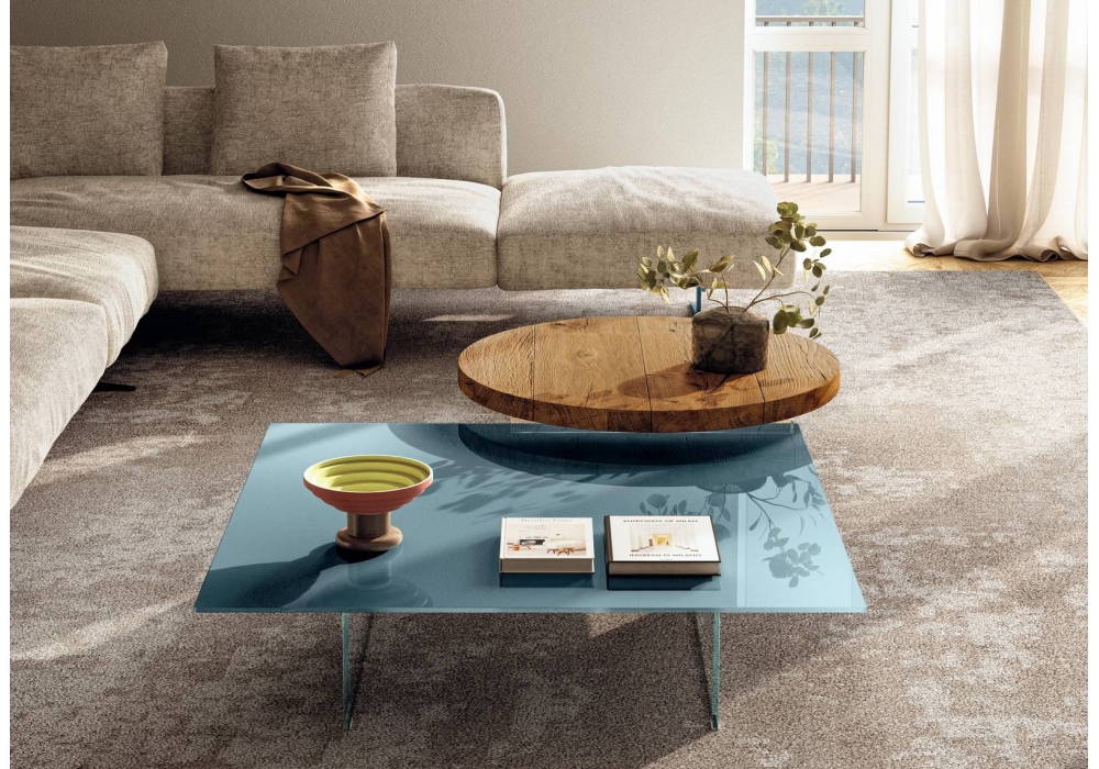 Air Glass von Daniele Lago für Lago entworfen, ist ein Couchtisch mit einer matten oder glänzenden Glasplatte und Beinen aus extraklarem oder rauchgrauem Glas. Verfügbar in mehreren Ausführungen und Abmessungen.