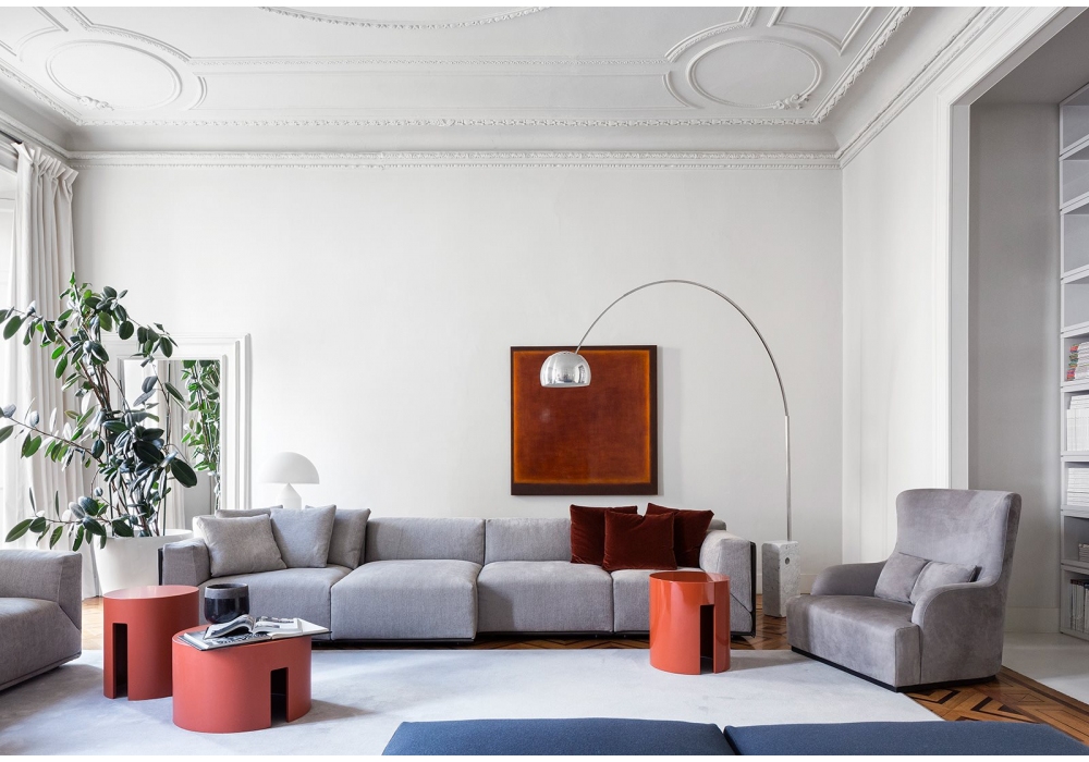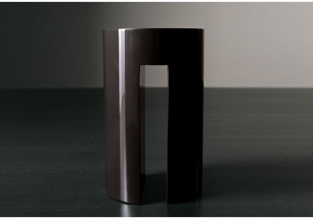 Gong von Andrea Parisio für Meridiani ist eine Beistelltischsammlung mit Holzgestell. Erhältlich in Eiche Furnier gebeizt, Lack Matt und Hochglanz, Harz, Kernleder.