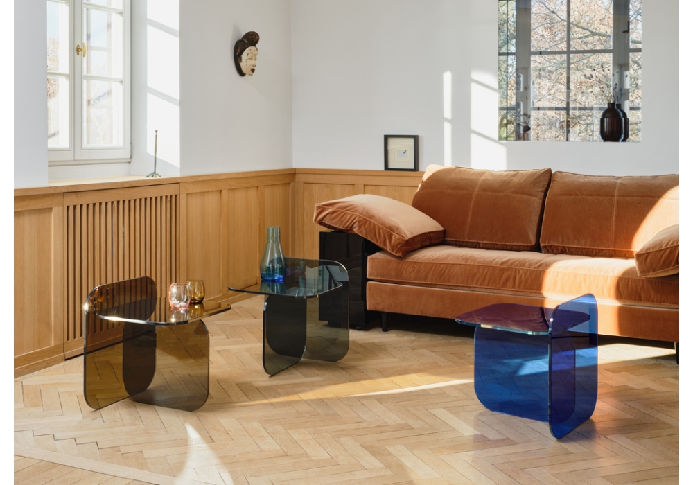 Sol von Ortega-Guijarro für ClassiCon entworfen, ist ein Beistelltisch aus Parsolglas in Bronze oder Grau. Oder Kristallglas mit Farbeinlage in Royalblau.