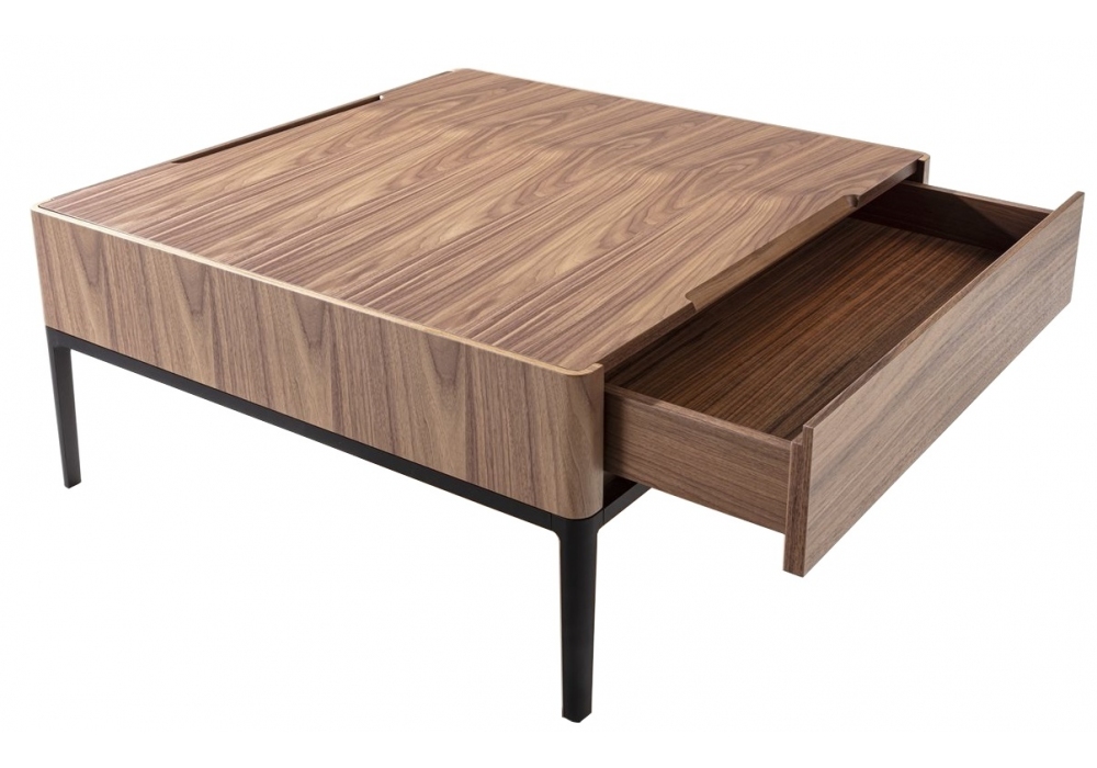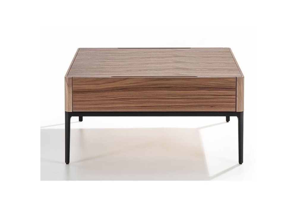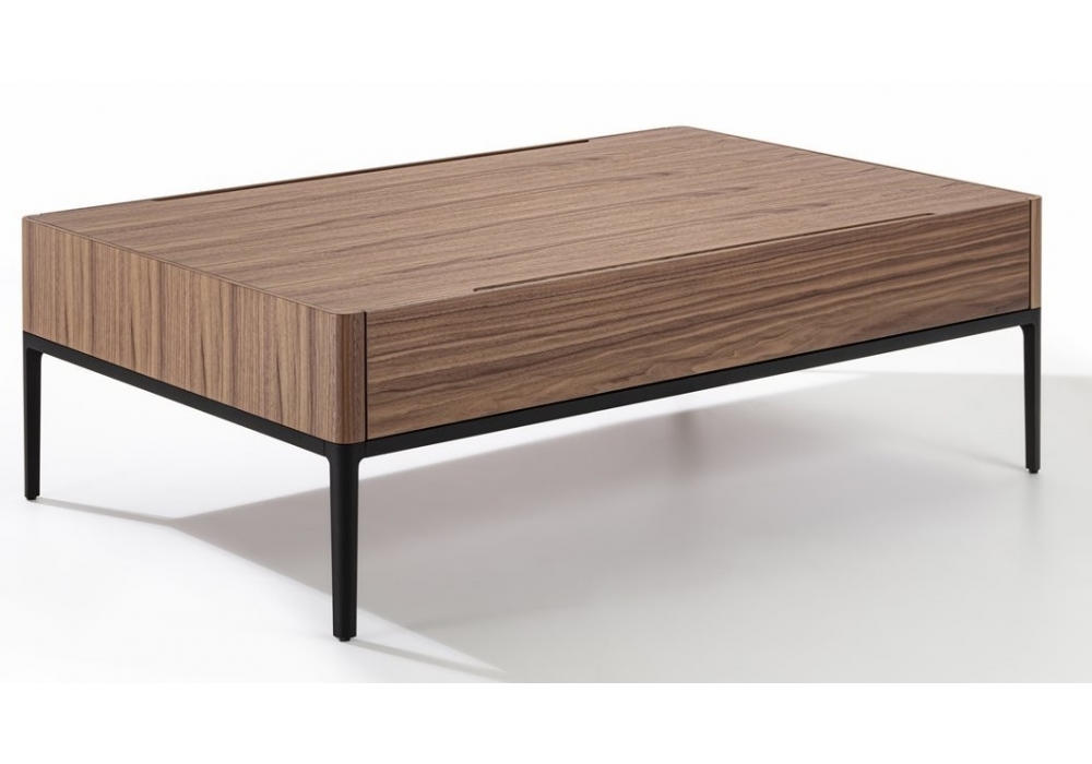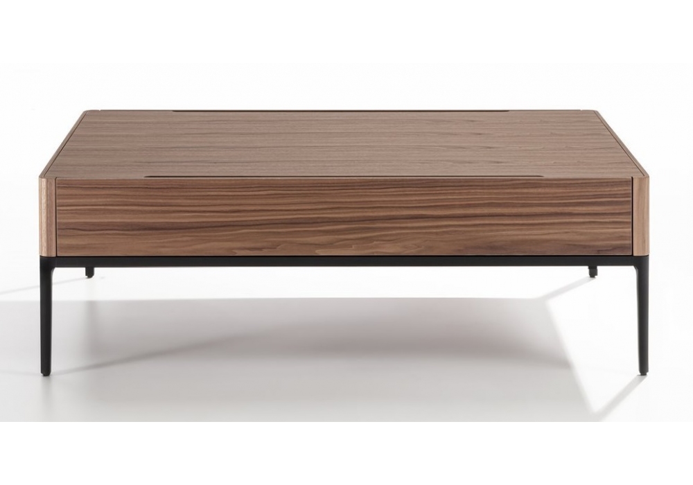 Chiba von D. Dolcini für Porada entworfen, ist ein Couchtisch mit Schubladen aus Canaletta-Walnuss und einer Struktur aus mattschwarz lackiertem Aluminium.