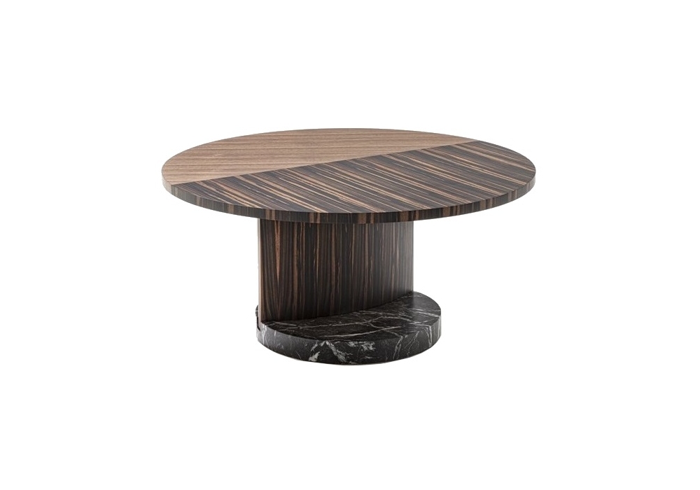 Leaf von Patrick Jouin für Porada entworfen, ist eine Sammlung von Couchtischen in mehreren Abmessungen, die aus Marmorsockel, Mittelbein und Holzplatte in den Ausführungen Double Canaletta Walnuss und Amara Ebenholz gefertigt sind.