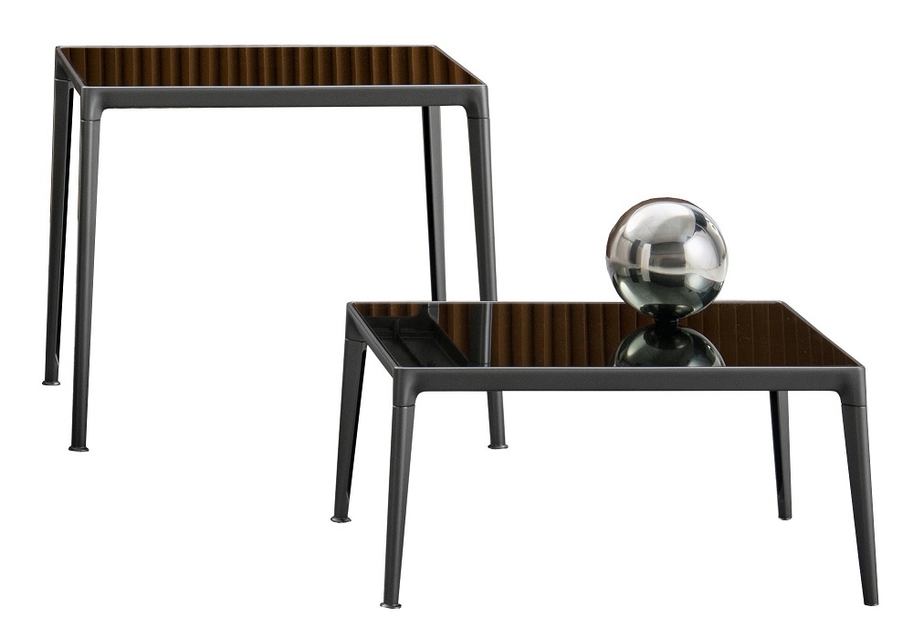 Mirto Indoor, von Antonio Citterio für B&B Italia entworfen , ist ein rechteckiger Beistelltisch aus lackierter oder hell gebürsteter Aluminiumstruktur und Oberseite in Marmor oder Glas erhältlich. In zwei Dimensionen erhältlich.