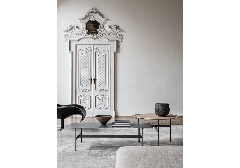 Formiche, von Piero Lissoni für B&B Italia entworfen , ist ein runder Beistelltisch mit Struktur aus zinnlackiertem Stahl und Tablett aus heller Eiche oder Aluminium mit Titan-Finish. In zwei Dimensionen erhältlich.