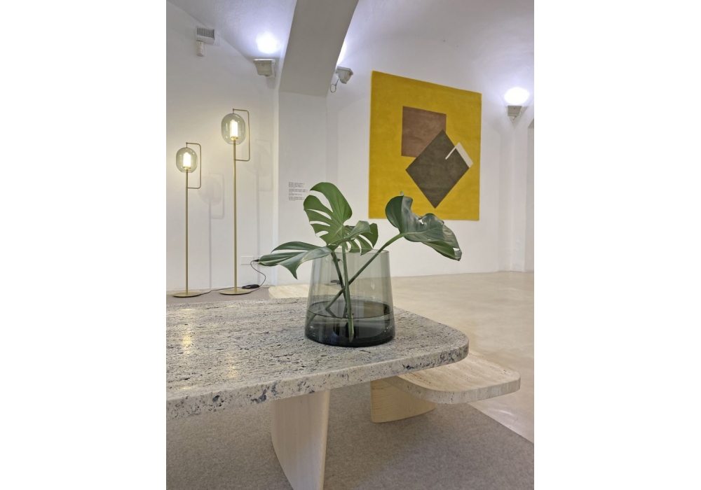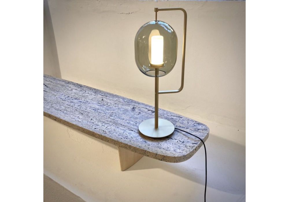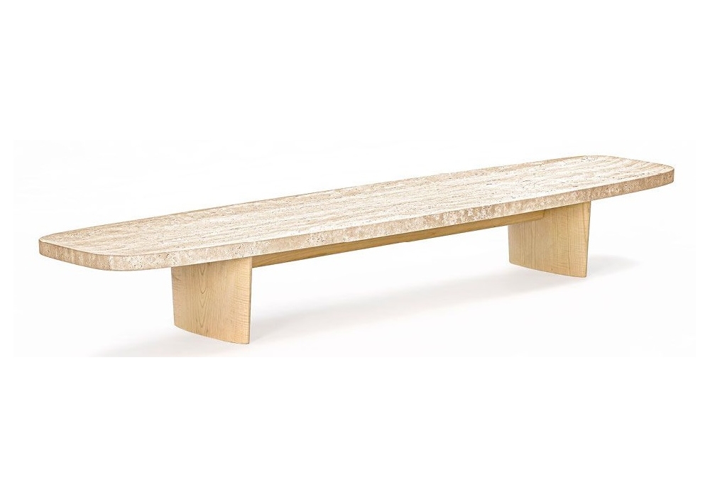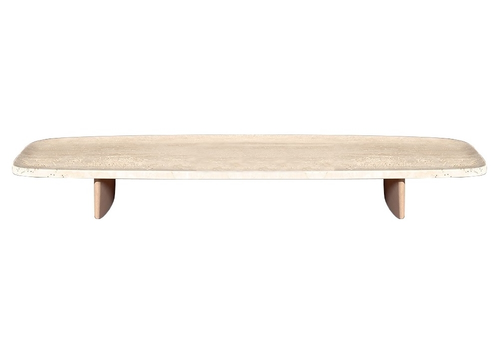 Matéria von Christian Haas für ClassiCon entworfen, ist ein Couchtisch mit Gestell aus massivem Ahorn natur, mit transparenter Lackierung. Top in Travertin natur oder mit indigofarbenen Vertiefungen. Oberer Träger aus hellem Elfenbein lackiertem Metall. Gleiter aus schwarzem Filz. In verschiedenen Abmessungen erhältlich.