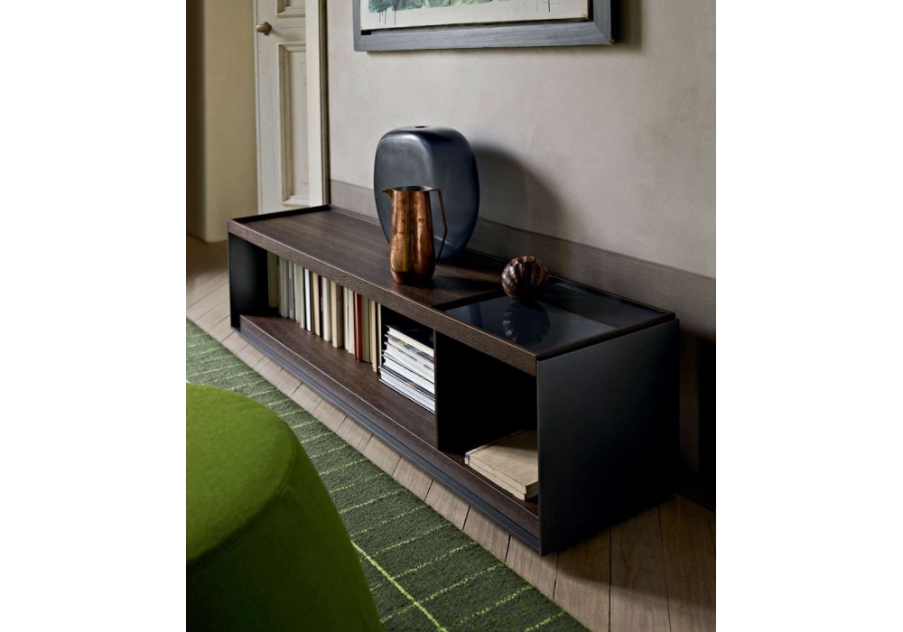 Surface von Vincent Van Duysen für B&B Italia entworfen, ist eine Kollektion von niedrigen Tischen mit Gestell aus Eiche grau, Eiche hell gebürstet, Eiche schwarz gebürstet oder Räuchereiche. Seitenwand und Sockelleiste aus Stahlblech nickel bronzefarben lackiert, schwarz verchromt lackiert oder glanzverchromt. Einsatz aus Paneel aus MDF Holzfaser satiniert oder glänzend lackiert.