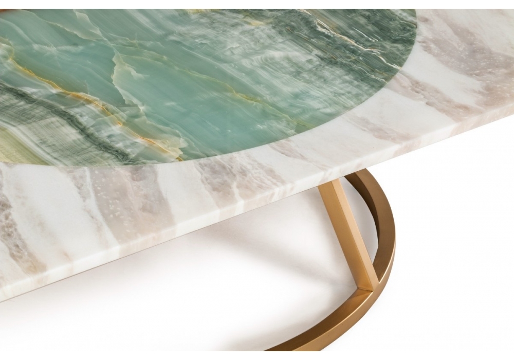 Pantheon von Maarten De Ceulaer für Budri entworfen, ist ein quadratischer Couchtisch mit einem Hintergrund aus Bianco Nuvola Marmor und einem zentralen Kreis aus Azul Sky Marmor. Basis aus satiniertem und goldgebürstetem Metall.