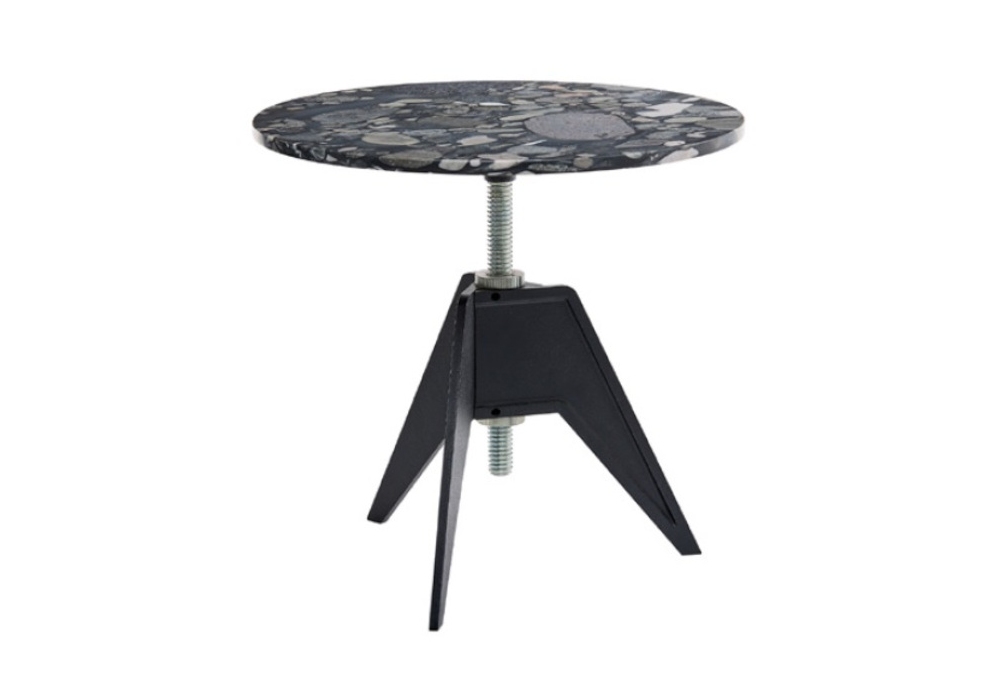 Screw Side von Tom Dixon entworfen, ist ein Couchtisch, der aus einer Basis mit einem Dreibein aus Gusseisen und einer Marmorplatte in verschiedenen Ausführungen besteht. Der Aluminiumdraht ermöglicht mehrere Höhen.