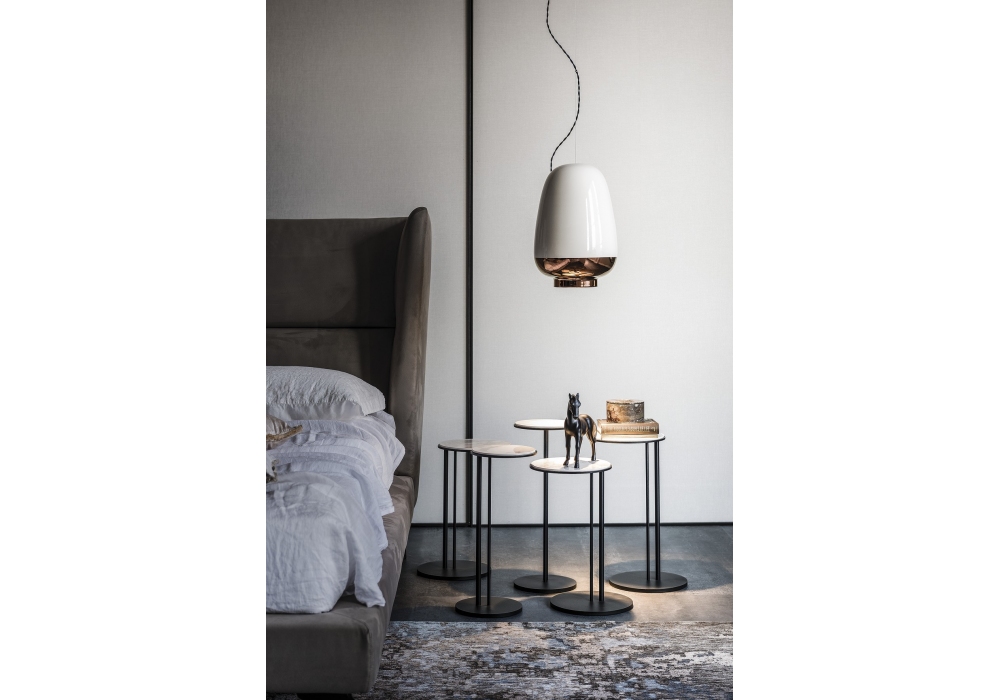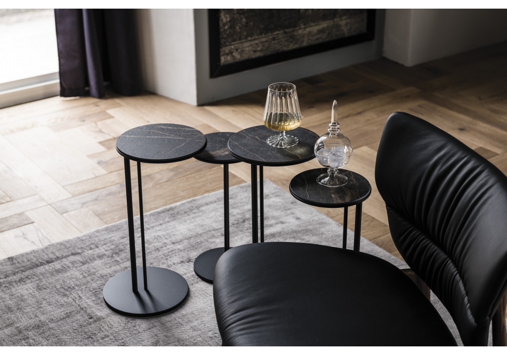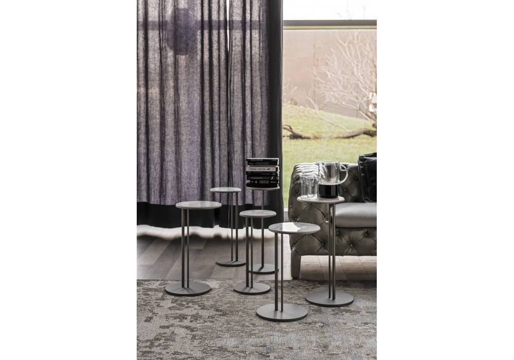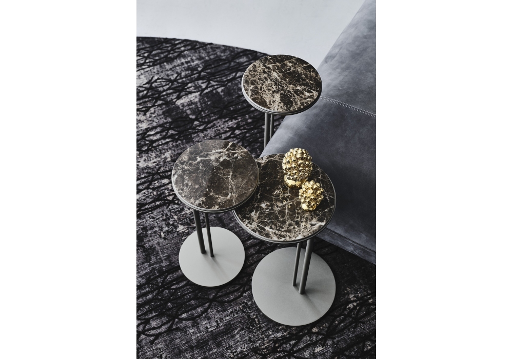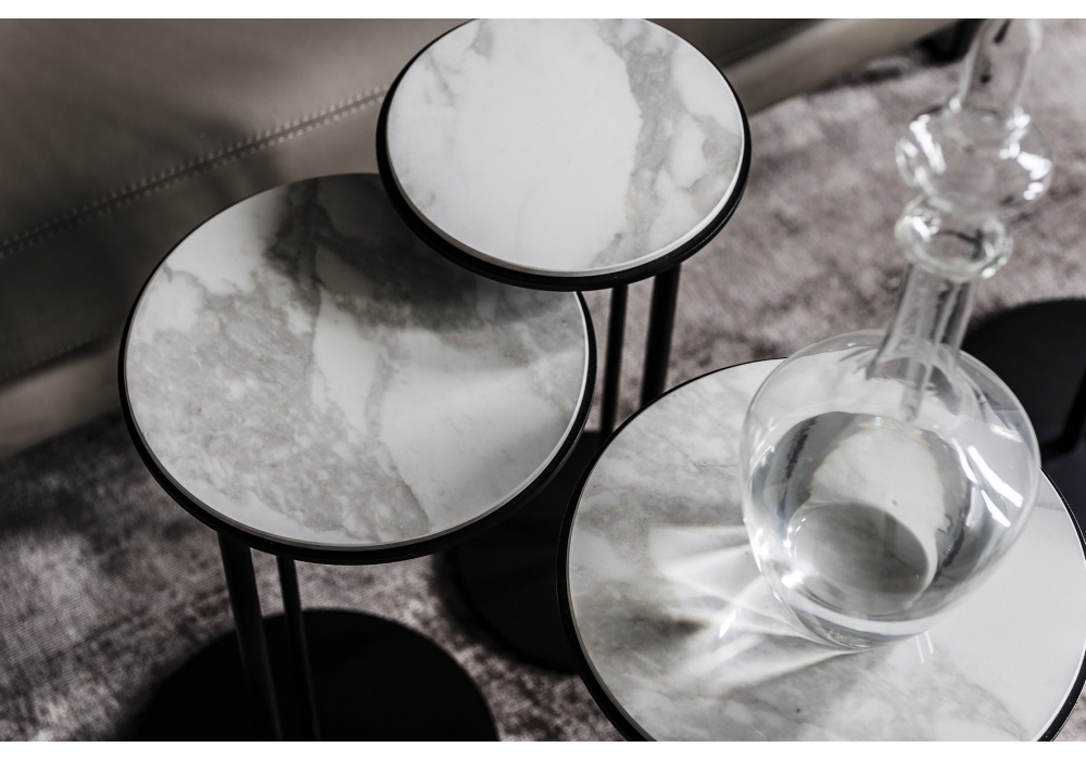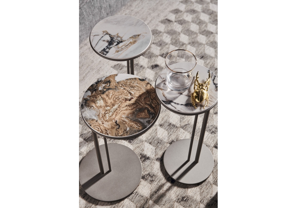 Sting von Paolo Cattelan für Cattelan Italia entworfen, ist eine runde Beistelltischkollektion mit Tischplatte aus Keramik Marmi in verschiedenen Farben. Stahlstruktur in schwarz, titan, bronze oder graphitgeprägtem Lack.