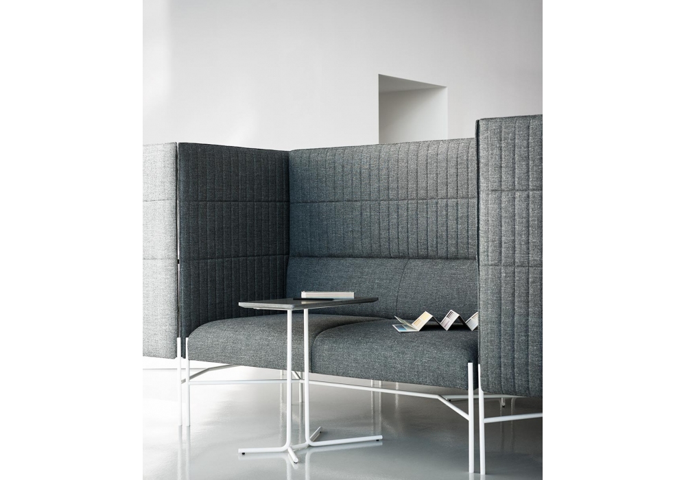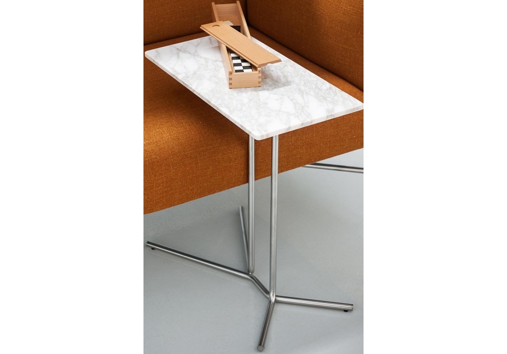 Ledge von Gordon Guillaumier für Tacchini signiert, ist ein Couchtisch mit Marmorplatte in verschiedenen Ausführungen. Die Basis ist aus röhrenförmigem Metall, erhältlich undurchsichtig chromatiert oder mit Epoxidpulver in verschiedenen Farben lackiert.