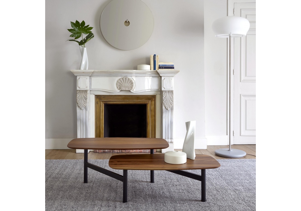 Pantographe von Müller Wulff für Ligne Roset entworfen, ist ein architektonischer, minimalistischer Couchtisch mit 2 Platten, die auf einem lackierten Untergestell übereinander liegen. Tischplatten verfügbar aus Nussbaum oder Keramiksteinzeug mit weißem Marmoreffekt.