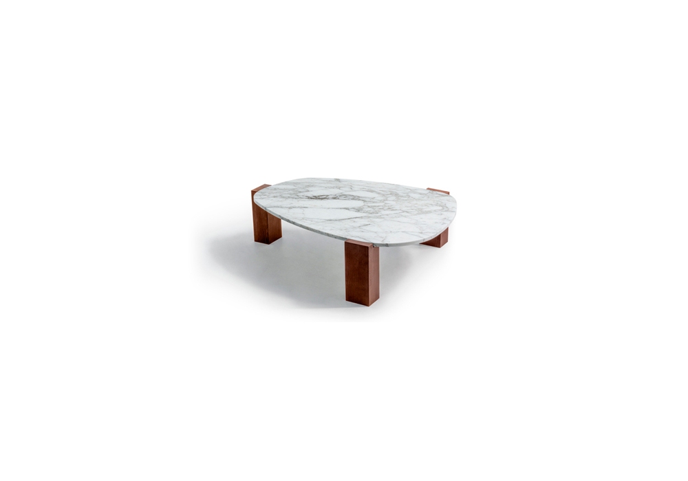 Gogan von Patricia Urquiola für Moroso entworfen, ist ein Couchtisch mit Tischplatte aus gehärtetem, geätztem und lackiertem extraklarem Glas oder aus poliertem Marmor. Sockel aus lackiertem, lamellenförmigem Eschenholz.