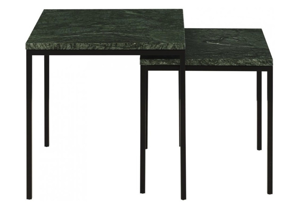 Amadora von Ligne Roset entworfen, ist ein quadratischer Beistelltisch mit Tischplatte in LATTE (brecha maritima), in VERDE (indischgrün) oder in CORSÉ (Marron emperador) farbigem Marmor, hochglanzpoliert mit fleckenabweisender Behandlung. Struktur aus mattschwarz lackiertem Stahl mit schwarzen Gleitern. Verfügbar in 2 Abmessungen.