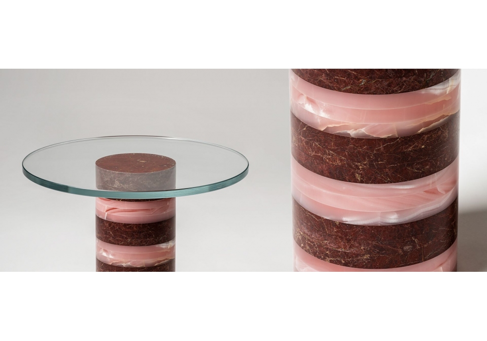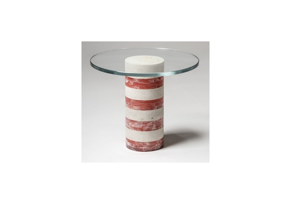 Architexture Side Table von Patricia Urquiola für Budri entworfen, ist ein Beistelltisch mit Mittelsäule aus gestreiftem Marmor und Tischplatte aus extra klarem gehärtetem Glas. Verfügbar in mehreren Ausführungen.