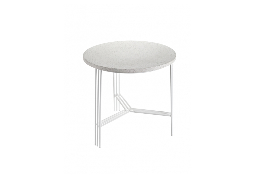 Terrazzo Circular von Antonino Sciortino für Serax entworfen, ist ein Couchtisch mit runder Platte aus Granit und einer tragenden Struktur aus Metallstäben, weiß oder schwarz lackiert. Terrazzo Circular ist in drei verschiedenen Größen erhältlich.