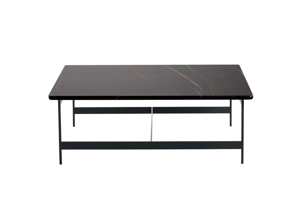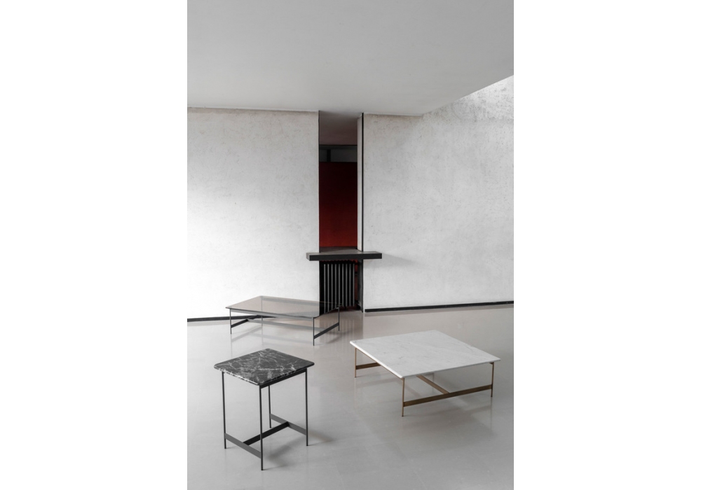 Little T von Potocco D&D für Potocco entworfen, ist ein viereckiger Couchtisch mit Untergestell aus lackiertem Metall und Platte aus Marmor, gehärtetem Glas oder Feinsteinzeug. Verfügbar in mehreren Abmessungen .