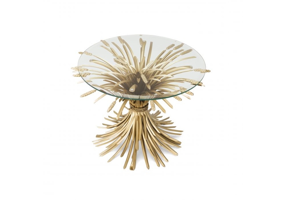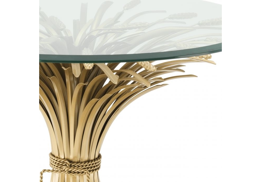 Side Table Bonheur von Eichholtz entworfen, ist ein Beistelltisch aus Eisen mit Antikgold-Finish, bestehend aus einer Basis in Form eines Bündels Gras und Stacheln und einer Platte aus abgeschrägtem transparentem Glas. Erhältlich in verschiedenen Größen.