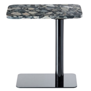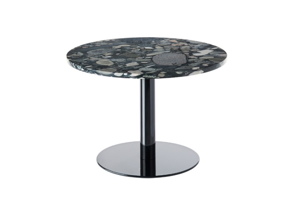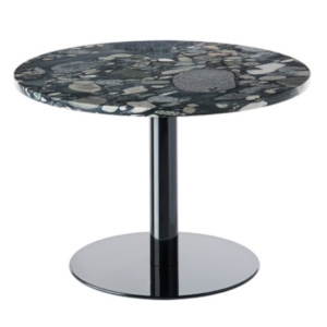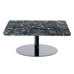 Stone von Tom Dixon entworfen, ist ein Couchtisch mit glänzend schwarzem Sockel und farbiger Marmorplatte. Erhältlich in quadratischer, runder oder rechteckiger Form.