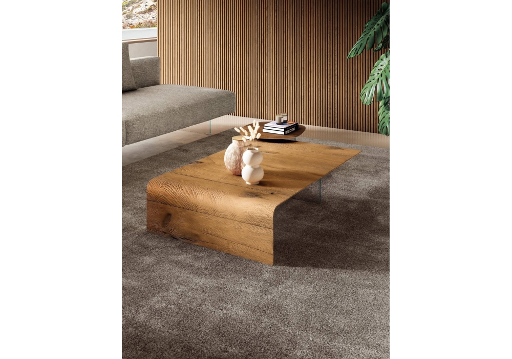 Lean von Daniele Lago für Lago entworfen, ist ein Couchtisch mit einer Platte aus Wildholz und Beinen aus extraklarem oder rauchgrauem Glas. Verfügbar in mehreren Ausführungen und Abmessungen.