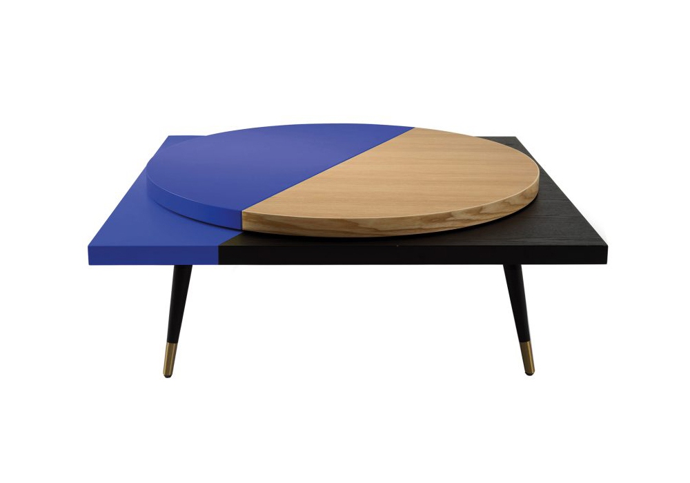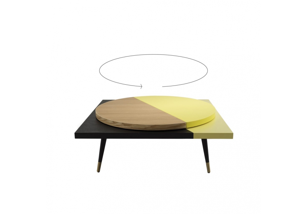 Lazy Susan von Thomas Dariel für Maison Dada entworfen, ist ein Couchtisch mit runder drehbarer Platte aus MDF mit Eichenfurnier und viereckiger Struktur, ebenfalls aus MDF mit Eichenfurnier und lackiert. Füße aus furniertem Metall mit Metallspitzen. Lazy Susan ist in verschiedenen Ausführungen erhältlich.