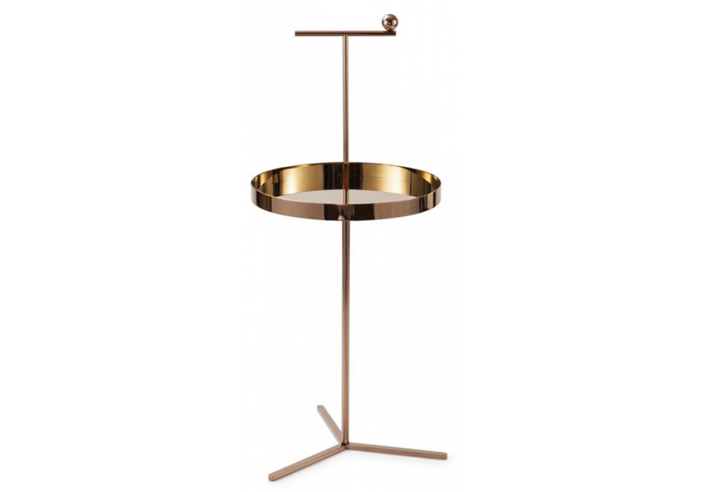 Off The Moon N°4, von Thomas Dariel für Maison Dada entworfen, ist ein Beistelltisch mit runder Platte und dreibeinigem Rohrfuß aus poliertem verkupfertem Metall.