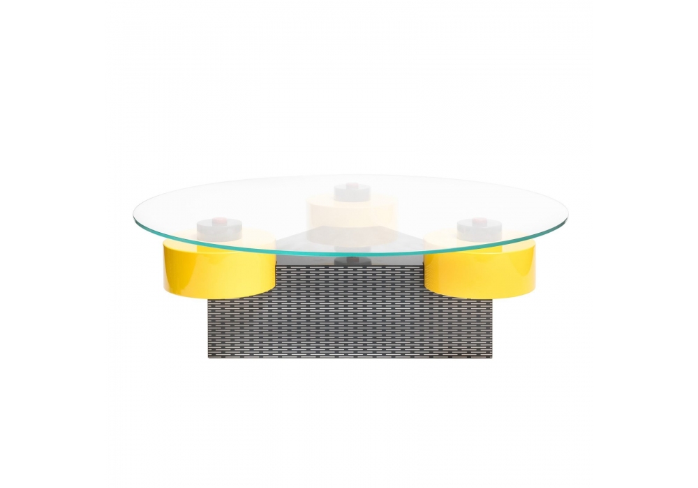 Atlas von Aldo Cibic für Memphis Milano entworfen, ist ein Couchtisch aus lackiertem Holz und mit dekorativem Laminat und Glasplatte bedeckt.
