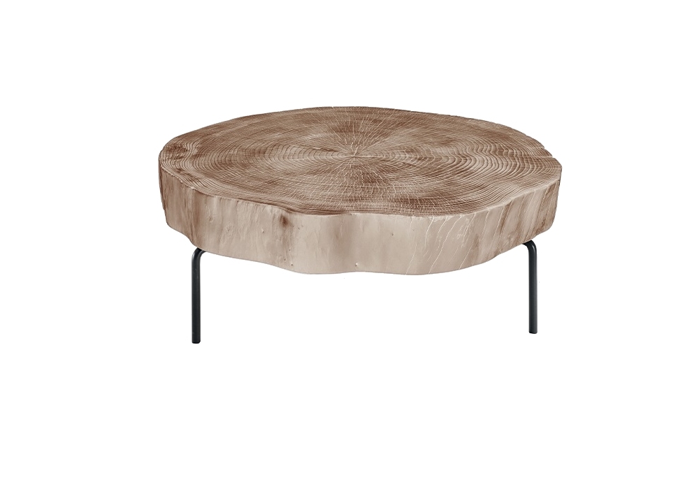 Disco von C.R. & S. Riva 1920 entworfen, ist ein Couchtisch aus massivem duftendem Zedernholz, das aus einem Querschnitt eines Stammes gewonnen wird, der die typischen konzentrischen Ringe hervorhebt. Es zeichnet sich durch natürliche Kanten aus und ist mit eisernen Rohrfüßen ausgestattet.