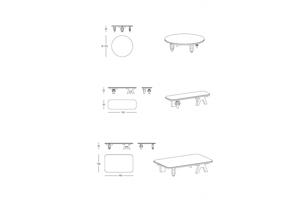 | Abmessungen | - 150 x 50 x H 35 cm; - Ø 120 x H 35 cm; - 160 x 100 x H 35 cm. |