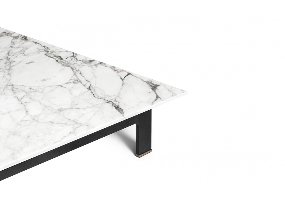Flying Landscape von Piero Lissoni für DePadova entworfen, ist ein niedriger Couchtisch aus Stahlblech mit rauer grauer Acrylfarbe und Füßen aus messingfarbenem thermoplastischem Material. Die Platte ist aus Marmor in verschiedenen Ausführungen. Der Tisch ist in verschiedenen Modellen und Größen sowie in der Ausführung neben dem Sofa erhältlich.