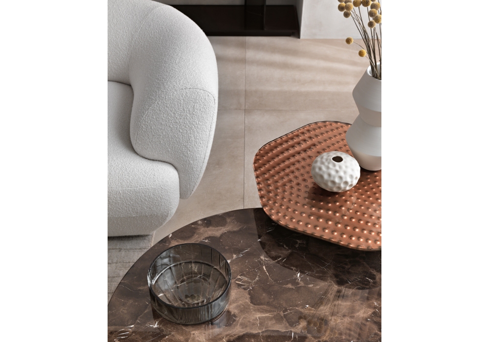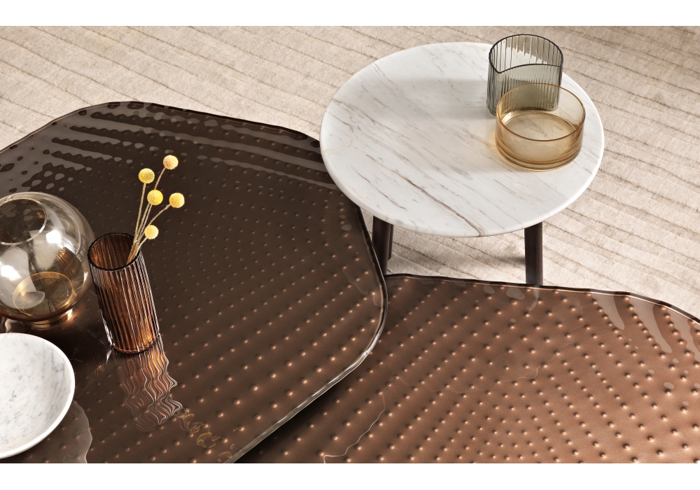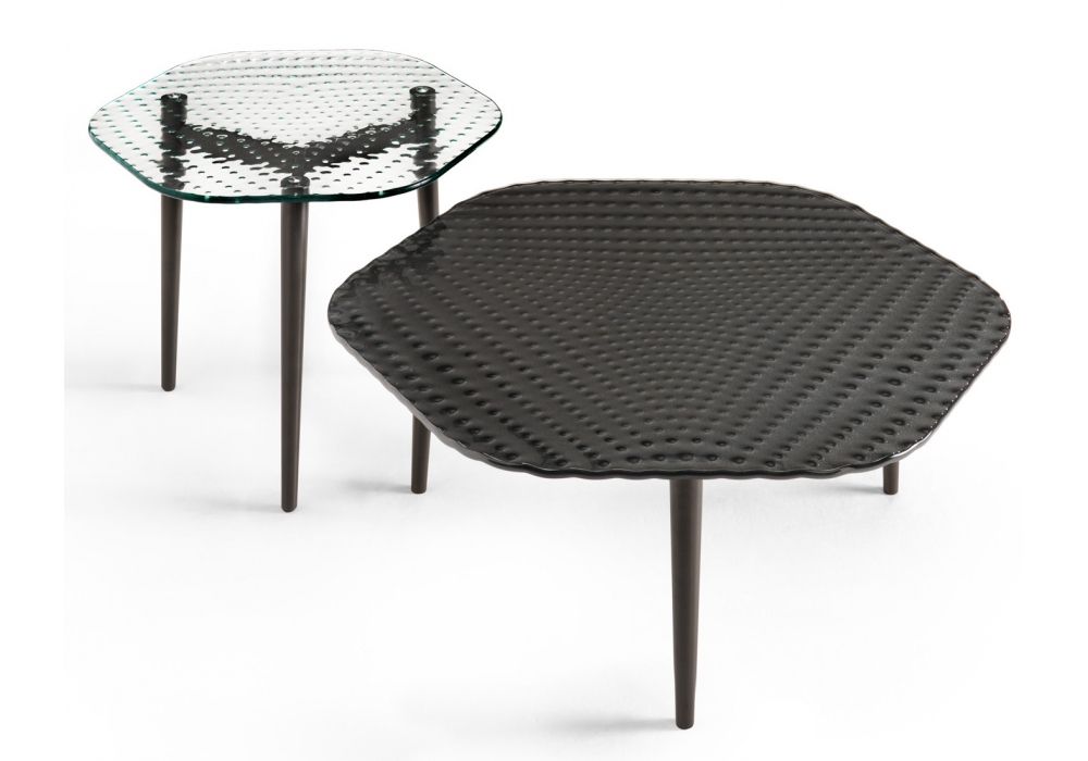 Coral Beach von Mac Stopa für Fiam entworfen, ist ein Couchtisch mit einer Platte aus geschmolzenem und gehärtetem Glas, transparent oder mit Metallic-Farben hinterlackiert. Sockel aus matt Lava Grey lackiertem Metall.