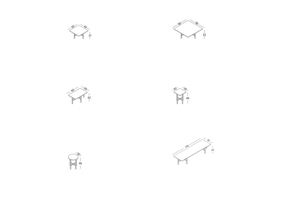 | Abmessungen | - Ø 30 x H 46 cm; - 30 x 30 x H 46 cm; - 60 x 30 x H 42 cm; - 60 x 60 x H 42 cm; - 60 x 60 x H 37 cm; - 60 x 60 x H 32 cm; - 90 x 90 x H 32 cm; - 150 x 35 x H 42 cm. |