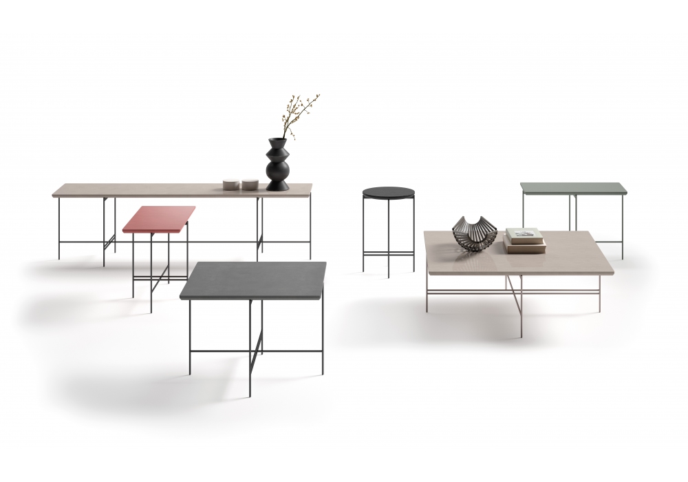 Boulevard, entworfen und hergestellt von Marac, ist ein Couchtisch mit MDF-Platte, die durch manuelle Beschichtung mit Marmorstaub, Lavastein oder farbigem Harz hergestellt wurde. Metallbasis mit Rohr Ø 10 mm, schwarz, champagner oder silberfarben. In verschiedenen Größen erhältlich.