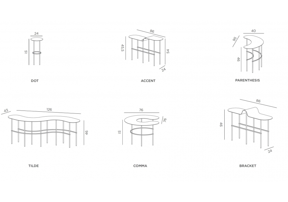 | Abmessungen | • Ø 24 x H 51 cm; • 86 x 24 x H 54 cm; • 95 x 40 x H 46 cm; • 126 x 38,5 x H 46 cm; • 76 x 76 x H 51 cm; • 86 x 24 x H 46 cm |