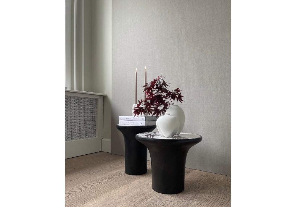 Trumpet von Kristian Sofus Hansen & Tommy Hyldahl für 101 Copenhagen entworfen, ist ein Couchtisch aus Zementfaser in Kaffeeausführung und Platte aus Calacatta-Marmor. Erhältlich in verschiedenen Größen.