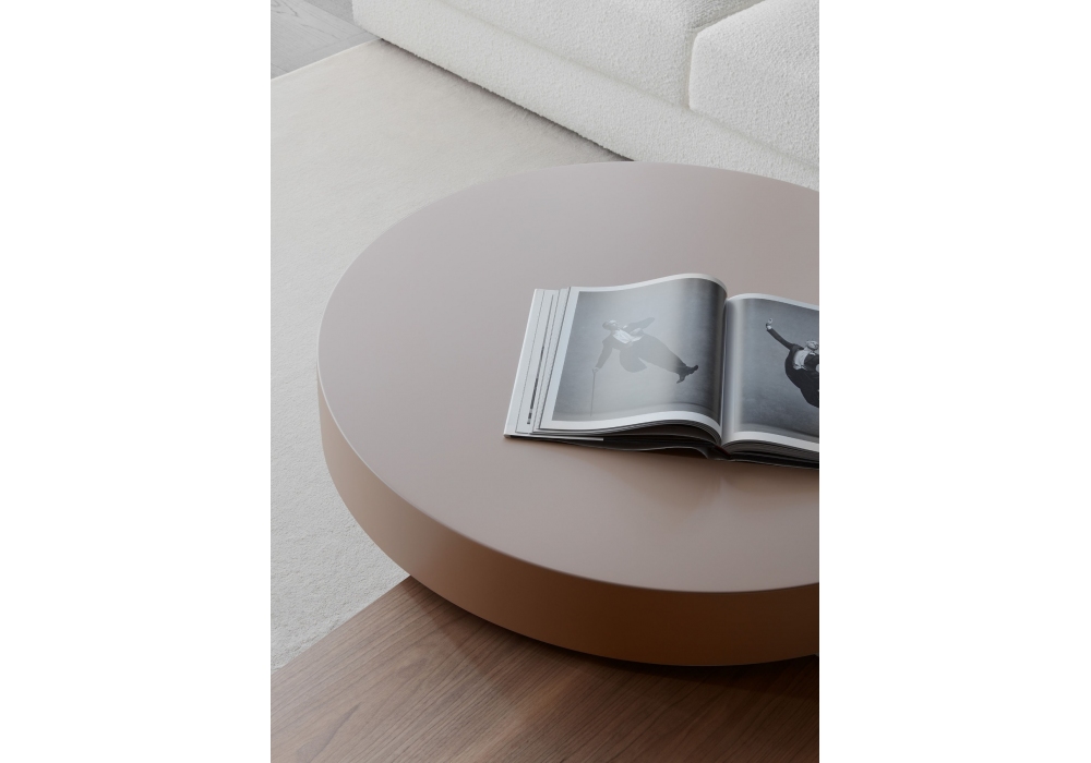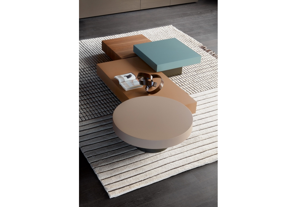 Dolmen, entworfen von David Lopez Quincoces für Lema, ist eine Familie von Couchtischen, die sich durch Platten mit natürlichen geometrischen Formen - rechteckig, quadratisch oder rund - auszeichnen, die frei untereinander zusammengestellt werden können. Die Struktur besteht aus bronzefarben lackiertem Metall, während die Platten in mattem Lack oder Holz erhältlich sind.