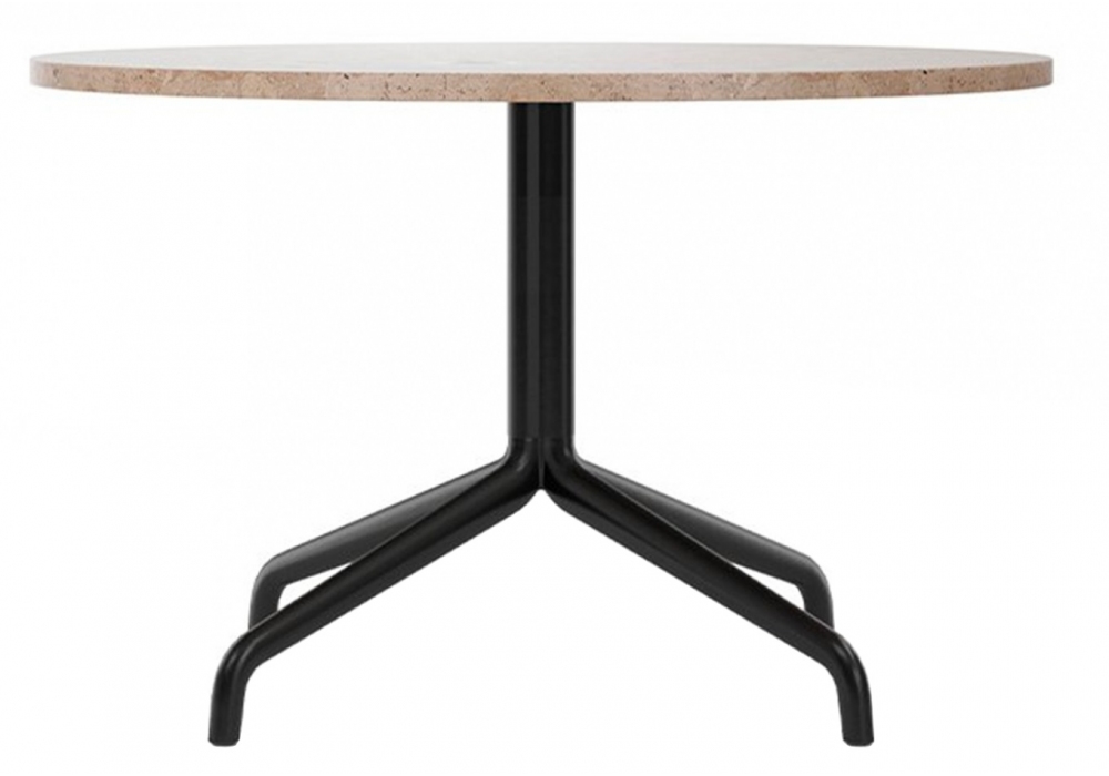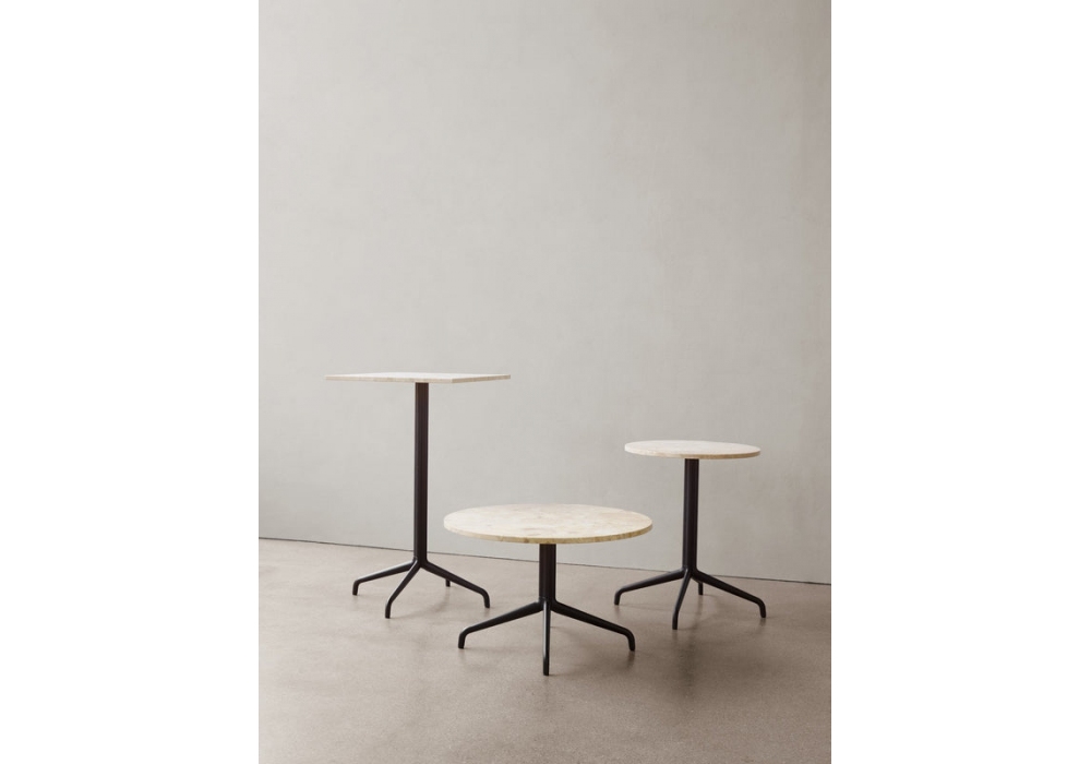 Harbour Star Lounge von Norm Architects für Audo Copenhagen entworfen, ist ein Couchtisch, der sich durch eine Platte aus Eiche, Linoleum oder Marmor und Beine aus Aluminium und schwarz pulverbeschichtetem Stahl auszeichnet.