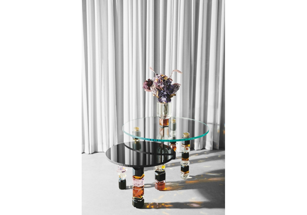 Louisiana hergestellt und entworfen von Reflections Copenhagen, ist ein runder Kristalltisch, der aus verschiedenen geometrischen Elementen besteht, die geschnitzt und von Hand in mehreren Farben bemalt wurden.