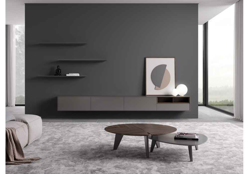 Trevo entworfen und hergestellt von Gual Design, ist ein matt lackierter dreieckiger Couchtisch. Verfügbar in verschiedenen Ausführungen.
