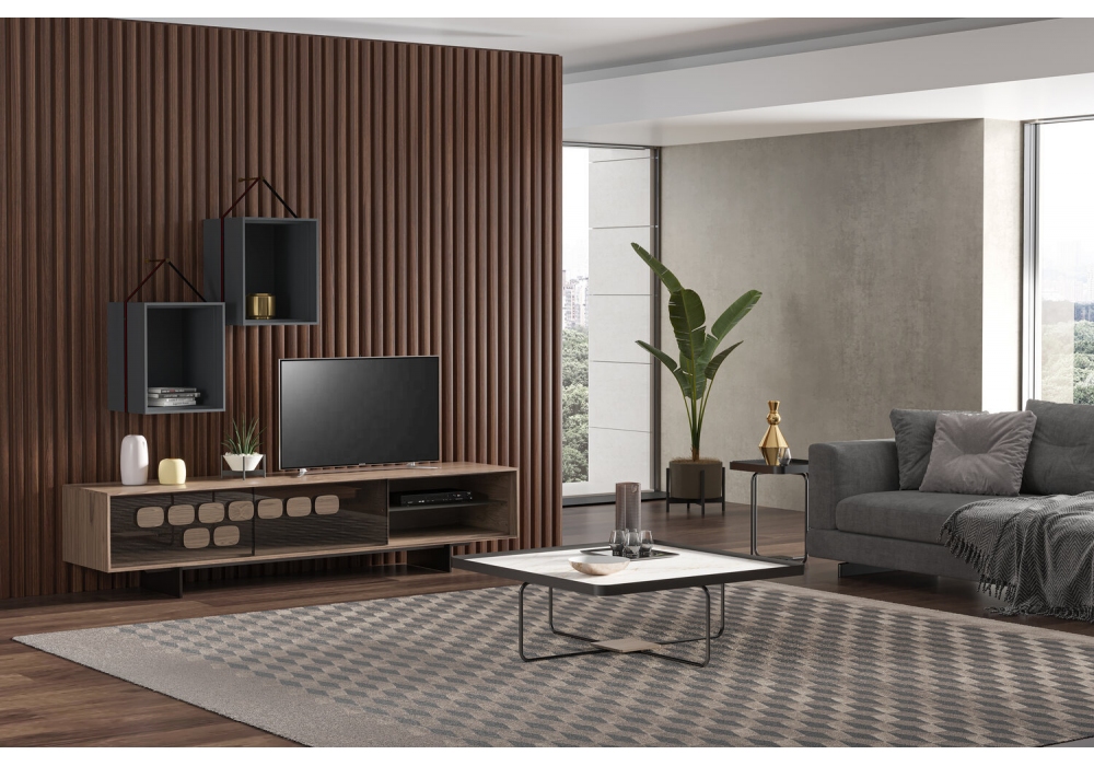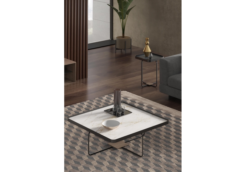 Michele entworfen und hergestellt von Gual Design, ist ein Couchtisch mit Basis aus schwarz lackiertem Eisen und Platte aus Keramik mit Calacatta- oder Marquina-Finish. Verfügbar in verschiedenen Abmessungen und Ausführungen.