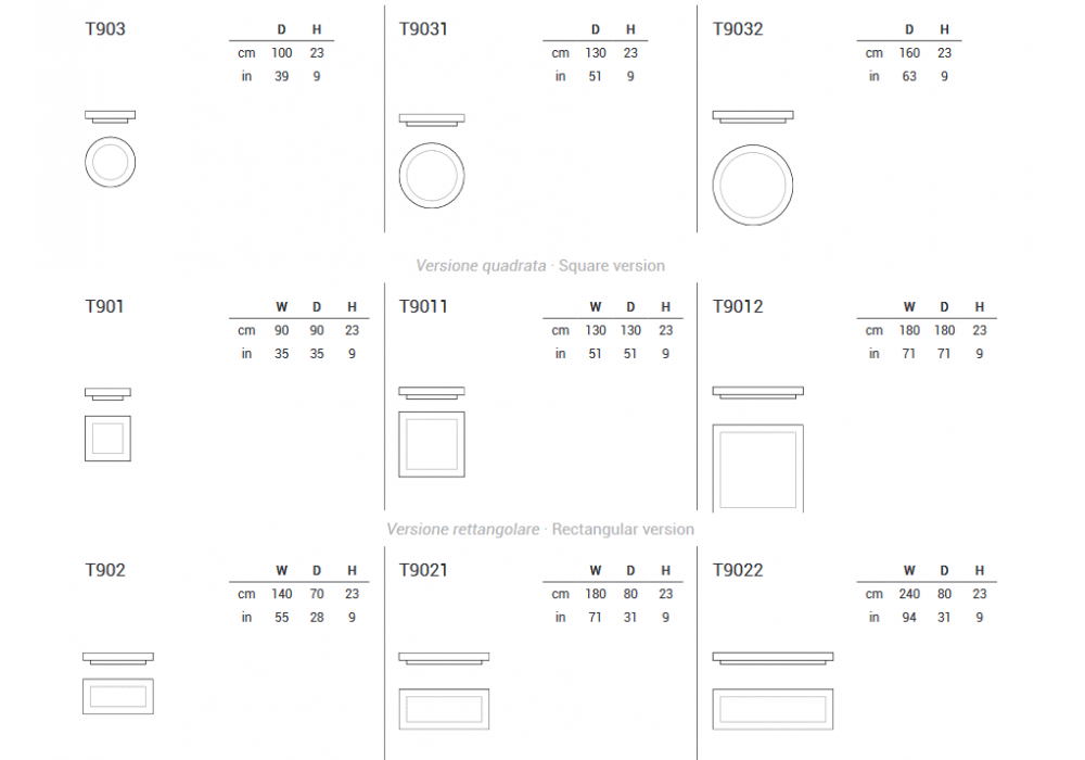 | Abmessungen | - Ø 110 x H 23 cm; - Ø 130 x H 23 cm; - Ø 160 x H 23 cm; - 90 x 90 x H 23 cm; - 130 x 130 x H 23 cm; - 180 x 180 x H 23 cm; - 140 x 70 x H 23 cm; - 180 x 80 x H 23 cm; - 240 x 80 x H 23 cm. |