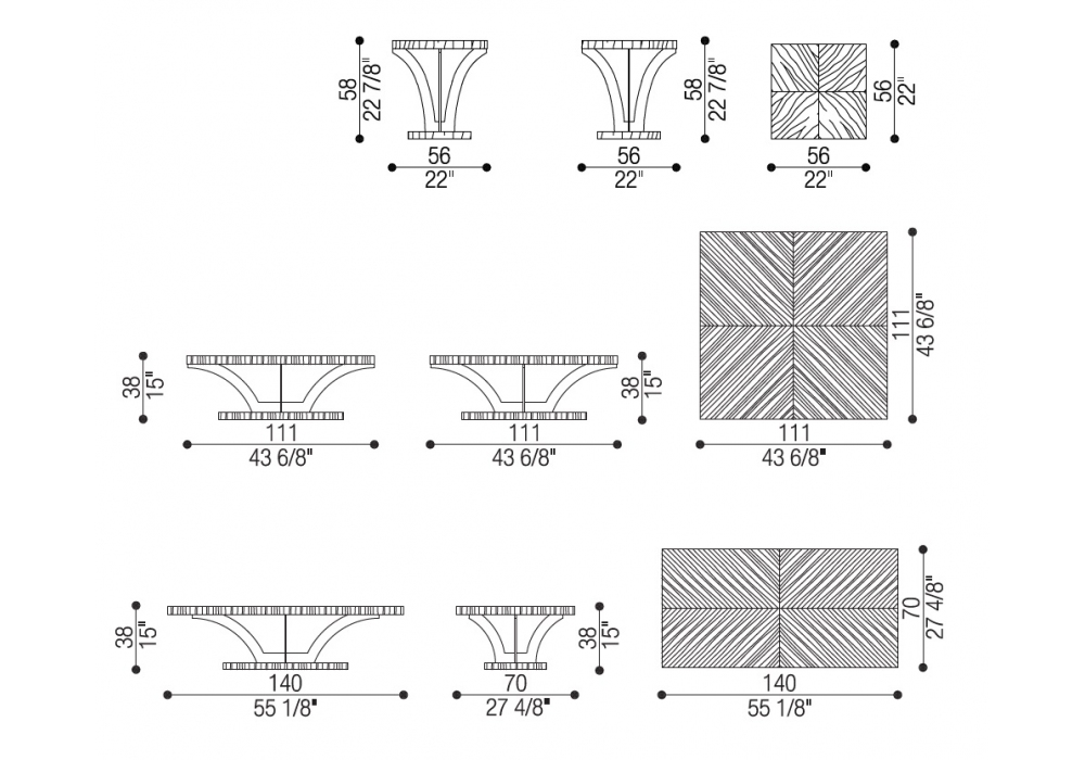 | Abmessungen | 56 x 56 x H 58 cm; 111 x 111 x H 38 cm; 140 x 70 x H 38 cm. |