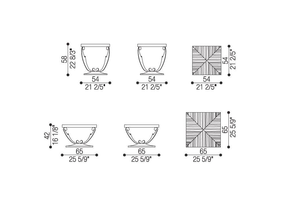 | Abmessungen | 54 x 54 x H 58 cm; 65 x 65 x H 42 cm. |
