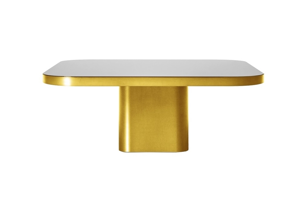 Bow No. 6 von Guilherme Torres für ClassiCon entworfen, ist ein Couchtisch aus massivem Messingblech, natur oder brüniert, transparent lackiert. Platte aus schwarz lackiertem Glas oder aus poliertem Marmor. Filzfüße, höhenverstellbar.