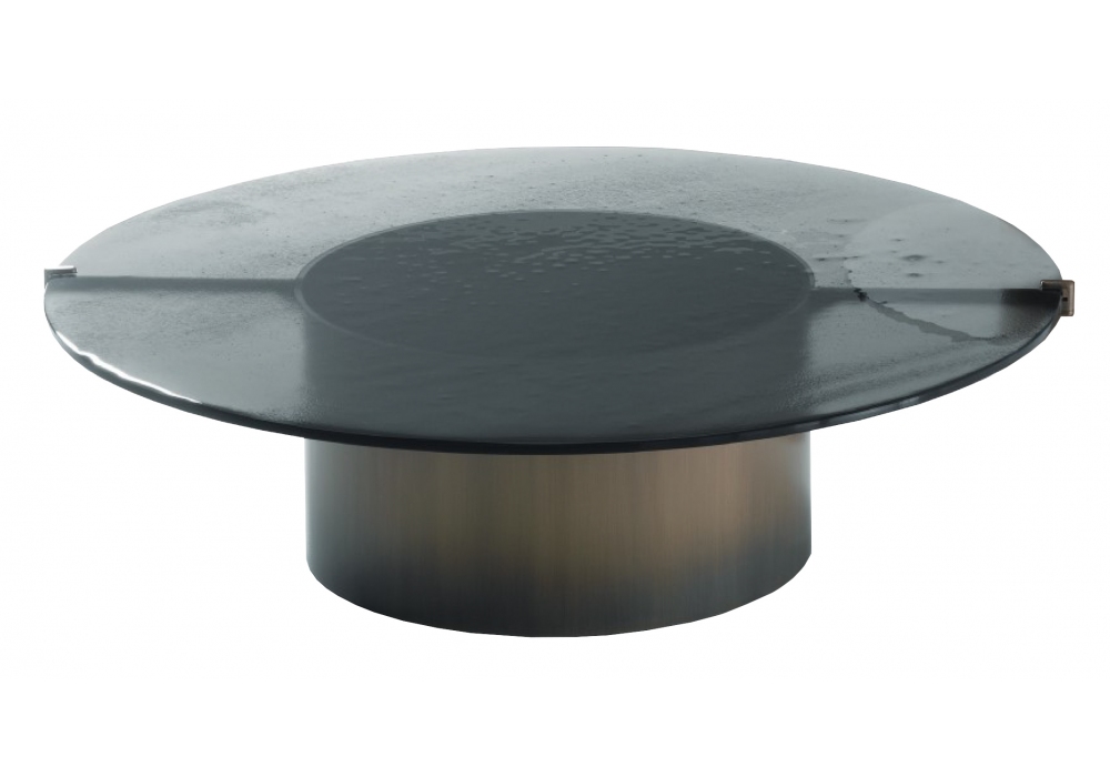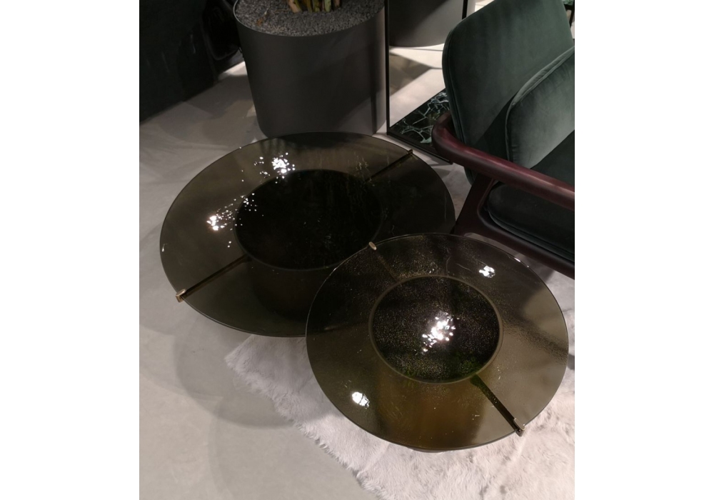 Eight entworfen und hergestellt von Ivano Redaelli, ist ein runder Couchtisch mit einer Basis, die mit Rädern ausgestattet ist, die vollständig aus bronzefarbenem Metall bestehen. Die Platte besteht aus dreischichtigem Schmelzglas, das in verschiedenen bronzierten oder geräucherten Ausführungen erhältlich ist.