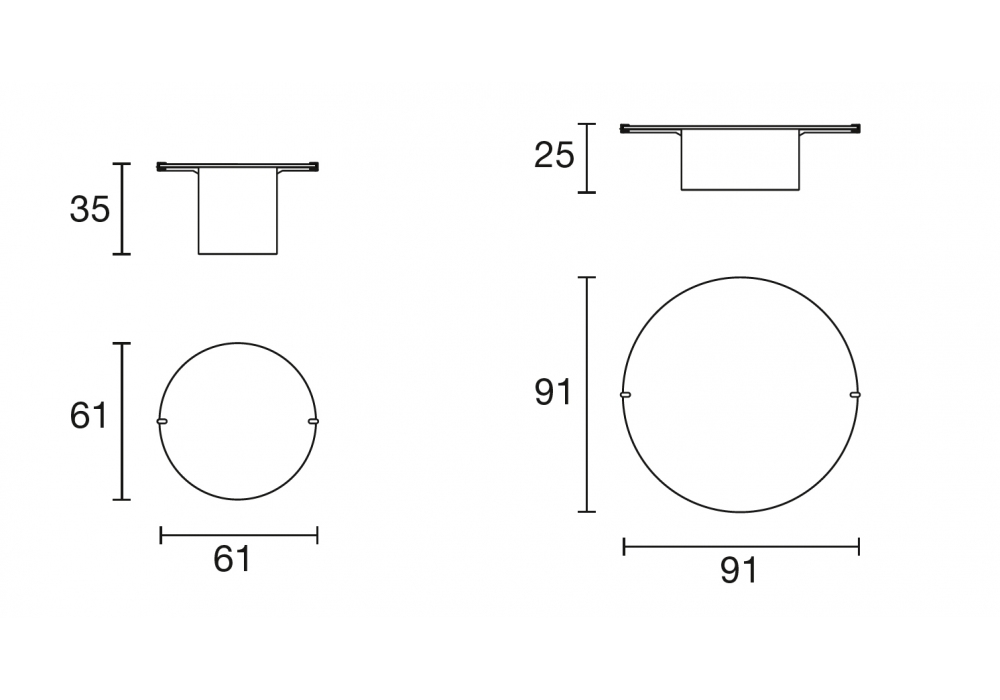 | Abmessungen | Ø 61 x H 35 cm; Ø 91 x H 25 cm. |