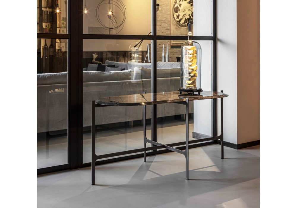 Sydney Oval von RedCreative für Enrico Pellizzoni entworfen, ist ein Couchtisch mit lackiertem Rohrfuß. Geformte Platte aus Marmor (Stärke 20 mm), bezogen mit Kernleder (Stärke 25 mm) oder aus Glas (10 mm).