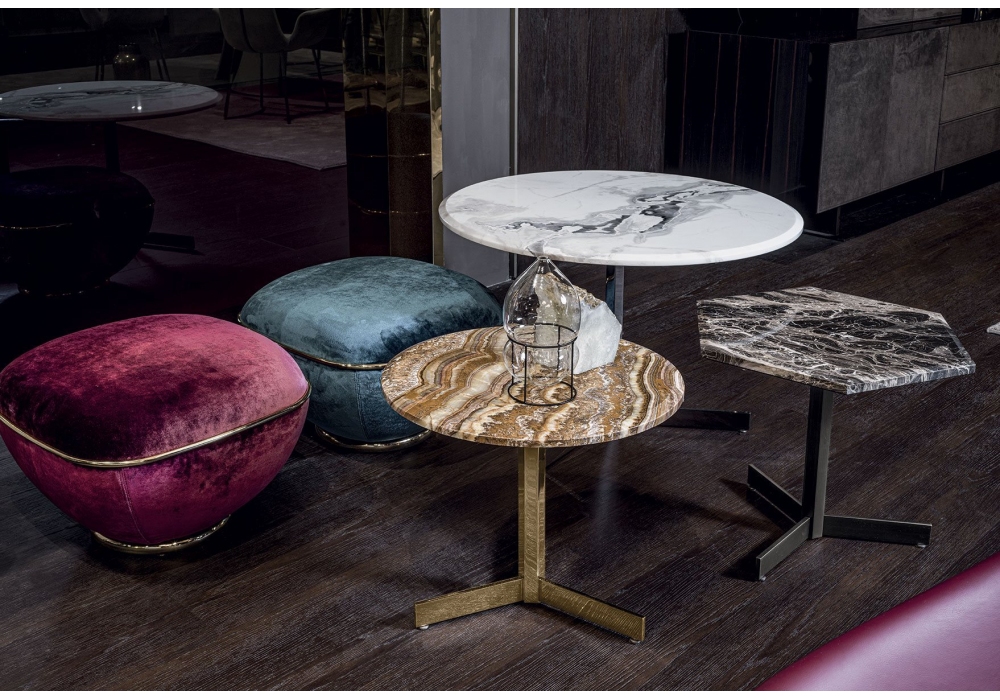 Math von AL1 für Longhi entworfen, ist ein Couchtisch mit Basis aus geschliffenem Metall in glänzender oder matter Ausführung und Platte aus Marmor, Onyx oder Spiegel. Verfügbar in verschiedenen Abmessungen.